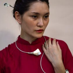 Mỗi đường gò chạm, uốn cong cánh hoa đều thể hiện nét tinh xảo và tinh thần hiện đại trong chất liệu truyền thống.